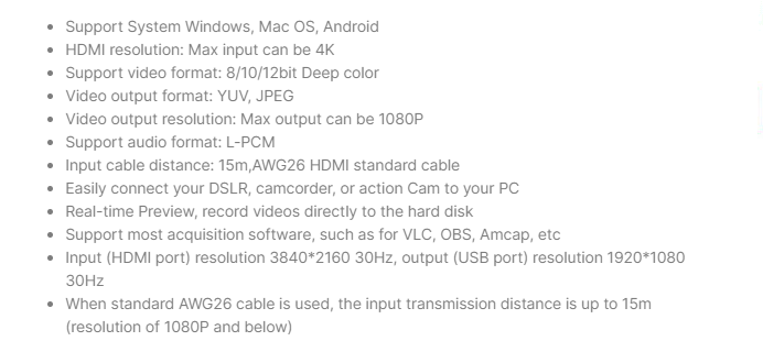 - Input (HDMI port) resolution 3840*2160 30Hz, output (USB port) resolution 1920*1080 30Hz